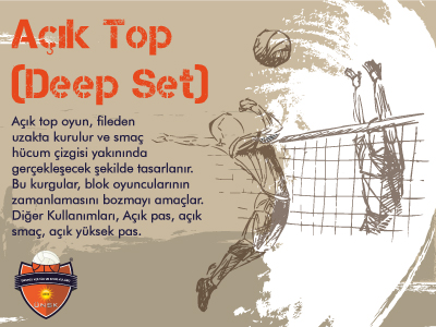 Açık top oyun‚ fileden uzakta kurulur ve smaç hücum çizgisi yakınında gerçekleşecek şekilde tasarlanır. Bu kurgular‚ blok oyuncularının zamanlamasını bozmayı amaçlar. Diğer Kullanımları, Açık pas‚ açık smaç‚ açık yüksek pas.