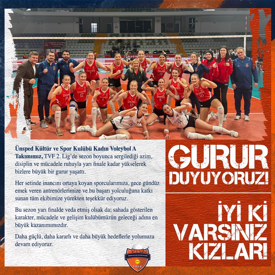 Ünsped Kültür ve Spor Kulübü Kadın Voleybol A Takımımız, TVF 2. Lig’de sezon boyunca sergilediği azim, disiplin ve mücadele ruhuyla yarı finale kadar yükselerek bizlere büyük bir gurur yaşattı.