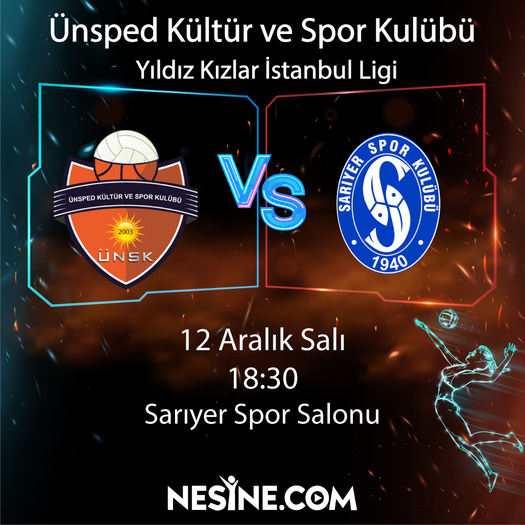 Yıldız Kızlar İstanbul Ligi Ünsped Kültür ve Spor Kulübü vs Sarıyer Spor KulübüTarih: 12 Aralık Salı (BUGÜN)Saat: 18:30Yer : Sarıyer Spor Salonu