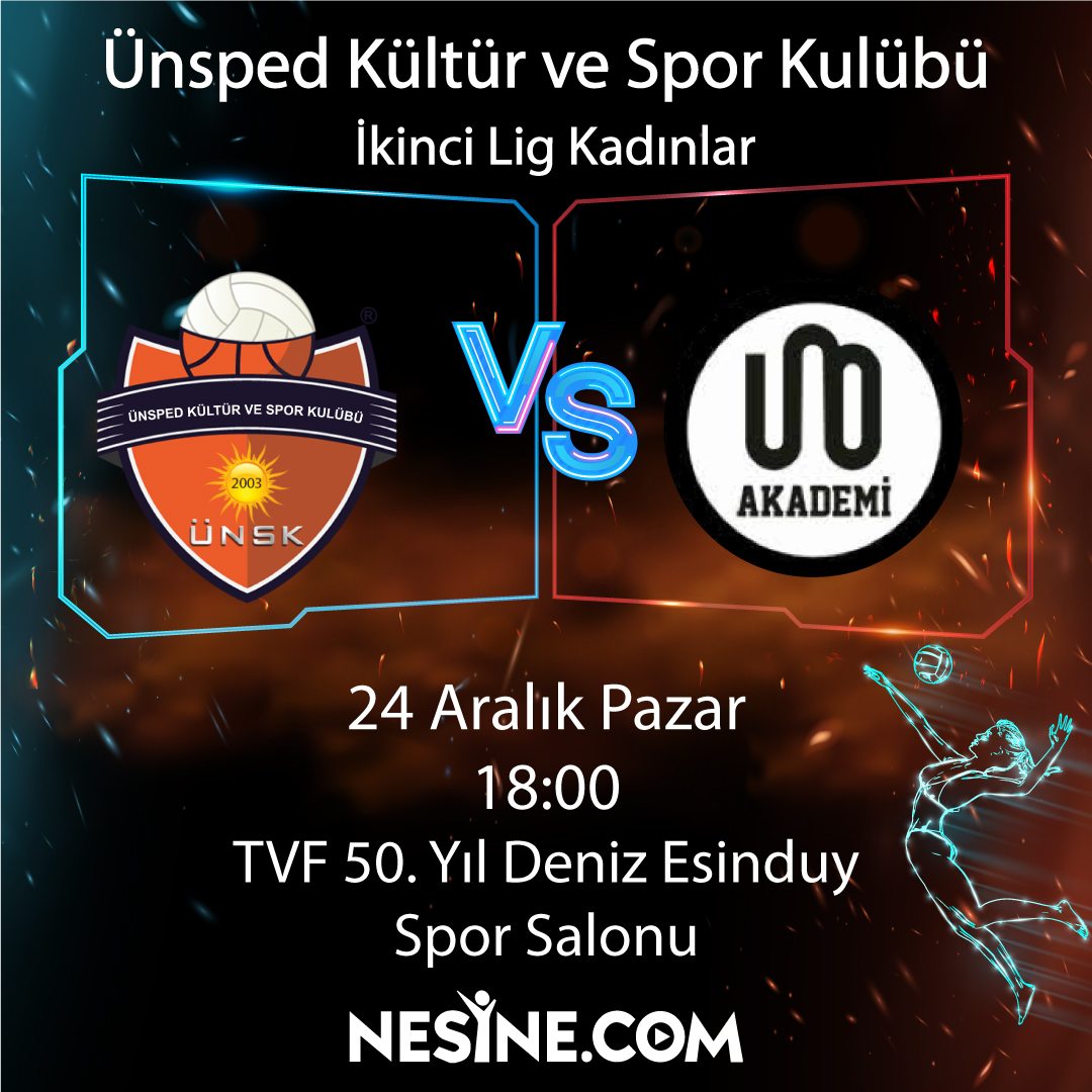 İkinci Lig KadınlarÜnsped Kültür ve Spor Kulübü vs Uno Akademi Tarih: 24 Aralık PazarSaat: 18:00Yer : TVF 50.Yıl Deniz Esinduy Spor Salonu