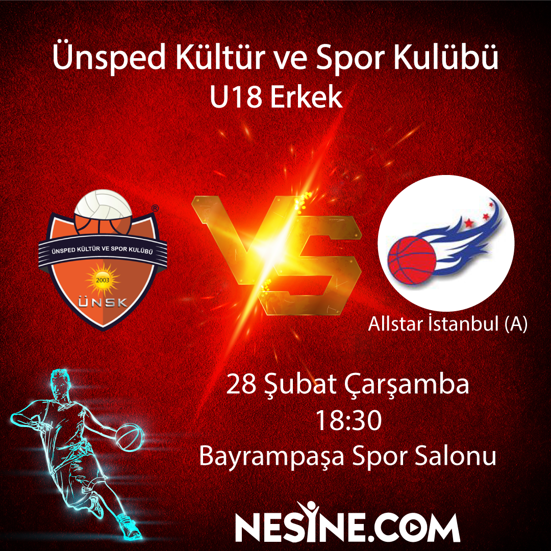 U-18 Erkek Ünsped Kültür ve Spor Kulübü vs Allstar İstanbul (A)Tarih: 28 Şubat ÇarşambaSaat: 18:30Yer : Bayrampaşa Spor Salonu