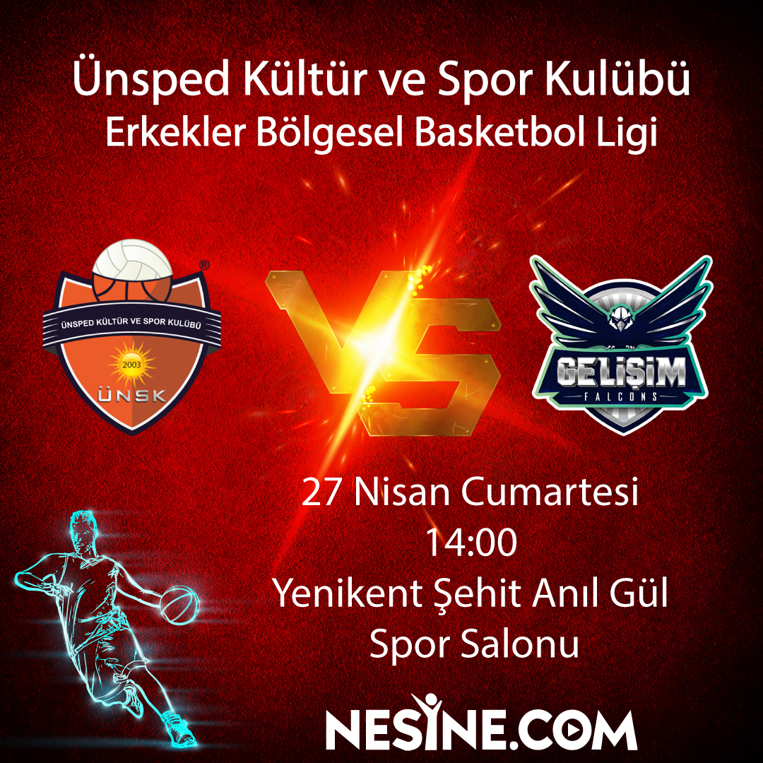 Erkekler Basketbol Bölgesel Ligi Ünsped Kültür ve Spor Kulübü vs Gelişim Falcons Tarih: 27 Nisan CumartesiSaat: 14:00Yer :Yenikent ŞEhit Anıl Gül Spor Salonu