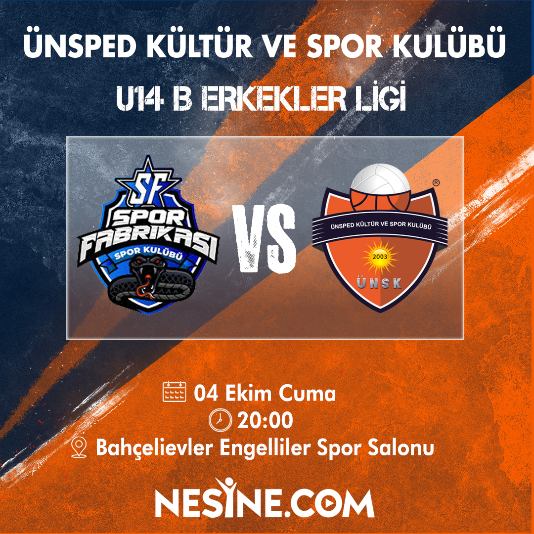 U14 B Erkekler Ligi Spor Fabrikası Spor Kulübü vs Ünsped Kültür ve Spor Kulübü Tarih: 04.10.2024 Cuma (YARIN)Saat: 20:00Yer: Bahçelievler Engelliler Spor Salonu
