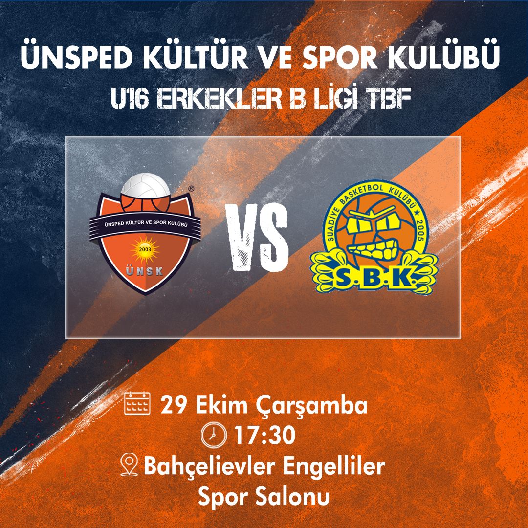 U16 Erkekler B Ligi TBFÜnsped Kültür ve Spor Kulübü vs Suadiye Basketbol KulübüTarih: 29 Ekim ÇarşambaSaat : 17:30Yer: Bahçelievler Engelliler Spor Salonu