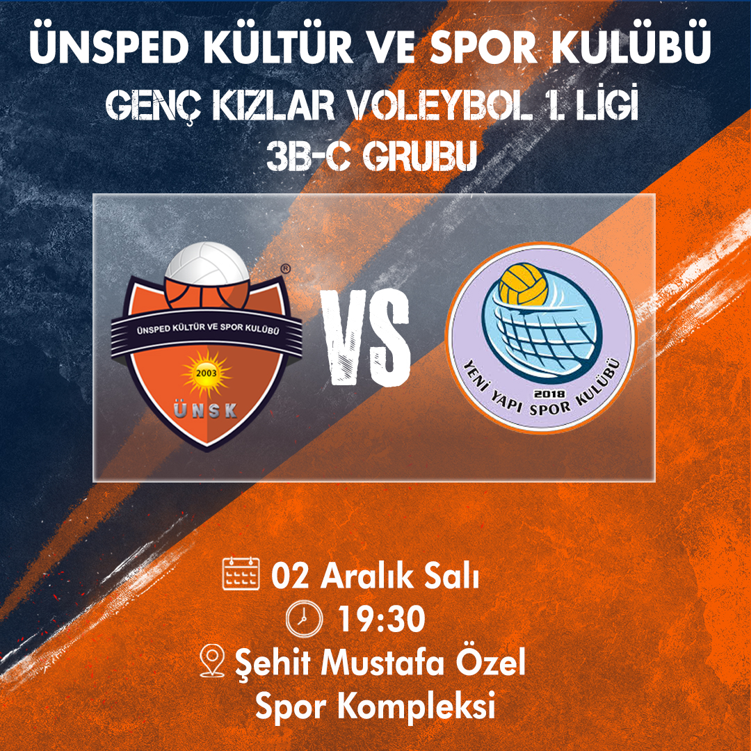 Takımını Yalnız Bırakma!Genç Kızlar Voleybol 1.Ligi 3B-C Grubu Ünsped Kültür ve Spor Kulübü vs Yeni Yapı Spor KulübüTarih: 02 Aralık Salı Saat :19:30Yer: Şehit Mustafa Özel Spor Kompleksi