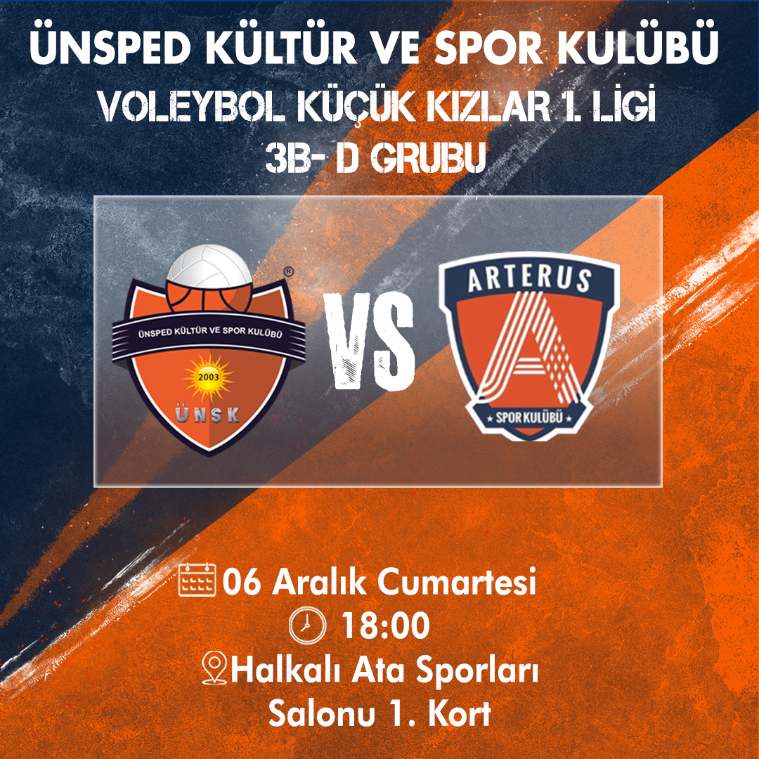 Voleybol Küçük Kızlar 1.Ligi 3B-D Grubu Ünsped Kültür ve Spor Kulübü vs ArterusTarih: 06 Aralık CumartesiSaat :18:00Yer: Halkalı Ata Sporları Salonu 1.Kat