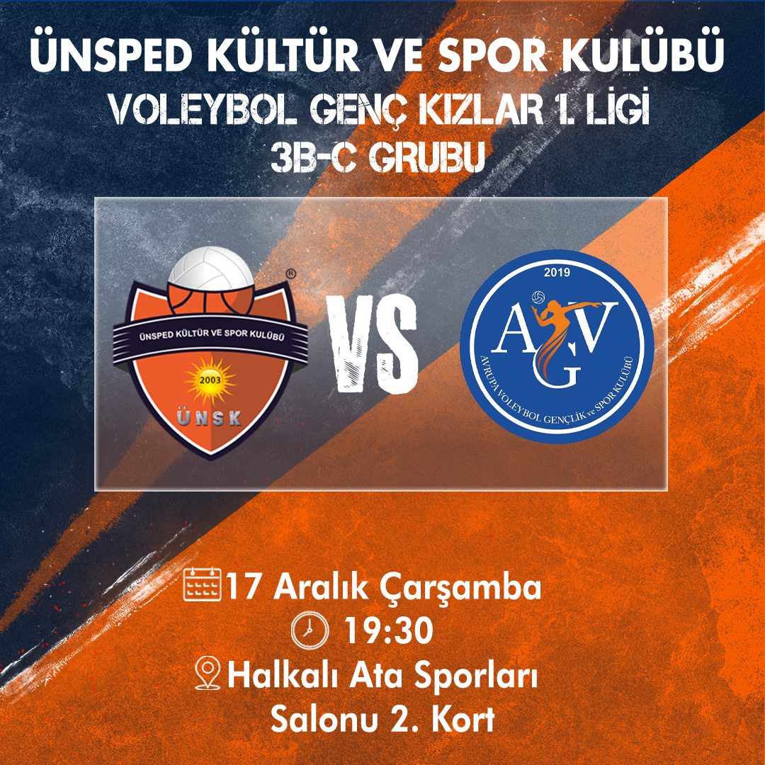 Voleybol Genç Kızlar 1.Ligi 3B-C Grubu Ünsped Kültür ve Spor Kulübü VS Avrupa Voleybol Gençlik ve Spor KulübüTarih: 17 Aralık Çarşamba Saat : 19:30Yer: Halkalı Ata Sporları Salonu 2.kort