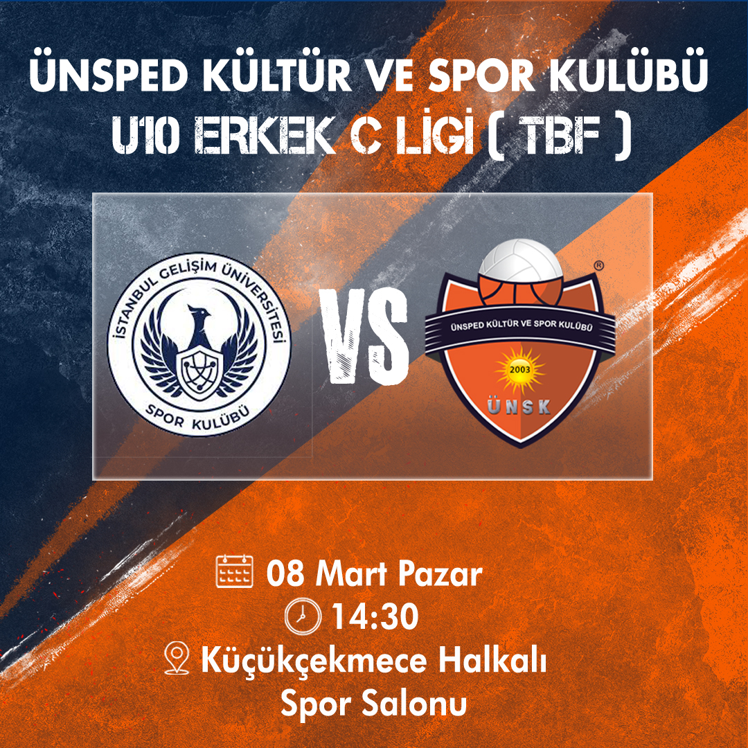 Takımını Yalnız Bırakma!U10 Erkek C Ligi (TBF) İstanbul Gelişim Üniversitesi VS Ünsped Kültür ve Spor Kulübü Tarih: 8 Mart Pazar Saat : 14:30Yer: Küçükçekmece Halkalı Spor Salonu